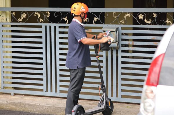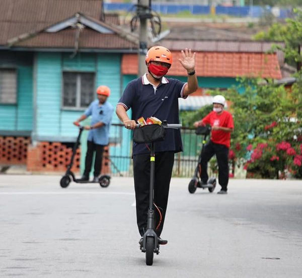 两名前首长,即国阵巫统林鲁候选人拿督斯里苏莱曼阿里和希盟诚信党武吉卡迪候选人阿德里,一人使用步行方式派发传单,另一人则乘坐电动滑板派送。