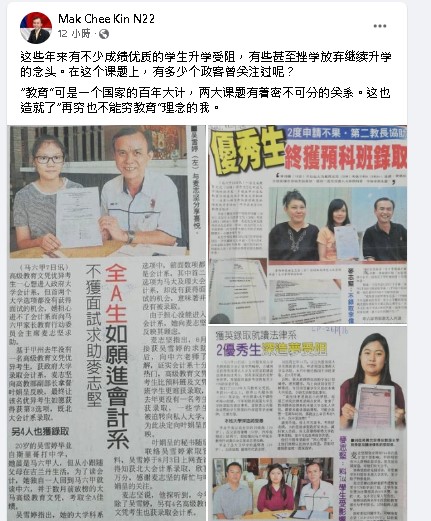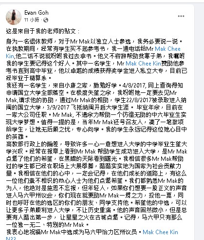 文中指出,她的老师希望怡力的选民助麦志坚一臂之力,投他一票,让正义的声音进入马六甲州议会,让更多子弟顺利进入大学,不让优秀生被拒大学门外的历史重演。
