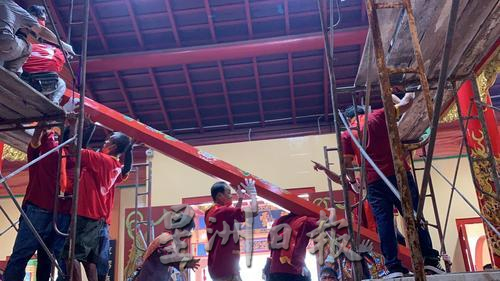 三忠宫进行陞樑仪式 出动18人安置888公斤大殿横樑
