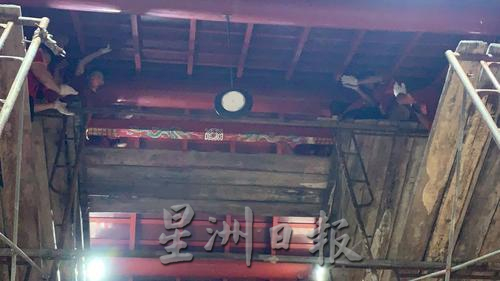 18名成员分批登上大殿内的鹰架,合力把横樑搬上屋顶处安置,整个过程约10分钟完成。