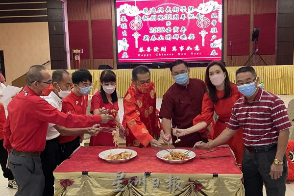 嘉宾捞生庆新年,右起蔡进发、王淑兰、颜天禄、蔡进兴、陈莉莉、蔡传豪、黎辉强及郭培坚。(范纯玮摄)