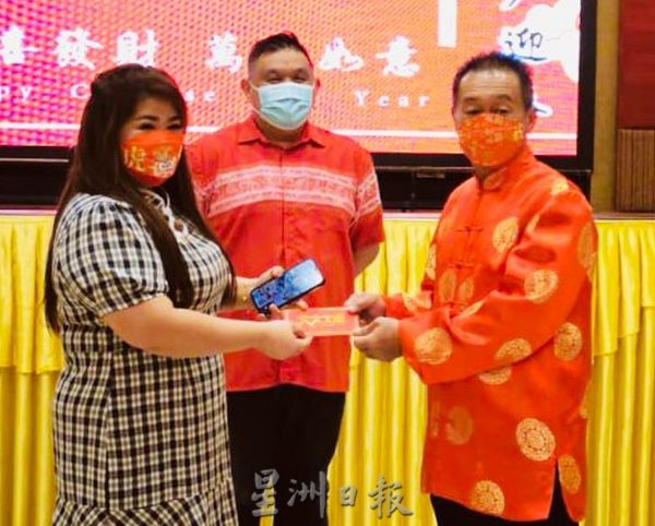 胡满化(左)捐2000令吉给蔡进兴武术学院做为活动基金,由蔡进兴(右)接领,颜天禄(中)见证。(范纯玮摄)