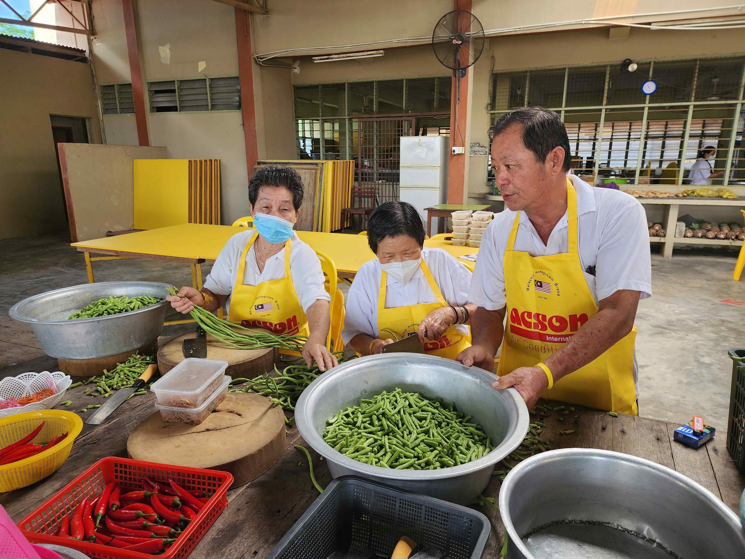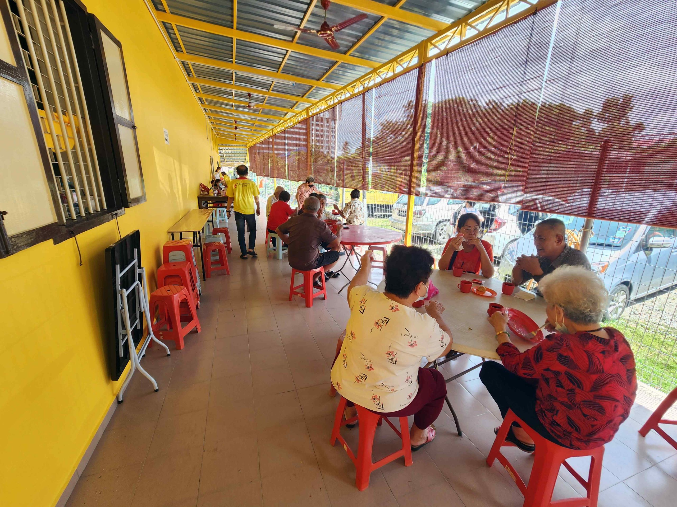 张健荣(右一)欢迎善信们在这九天内前来打包午餐及晚餐。(戴小同摄)