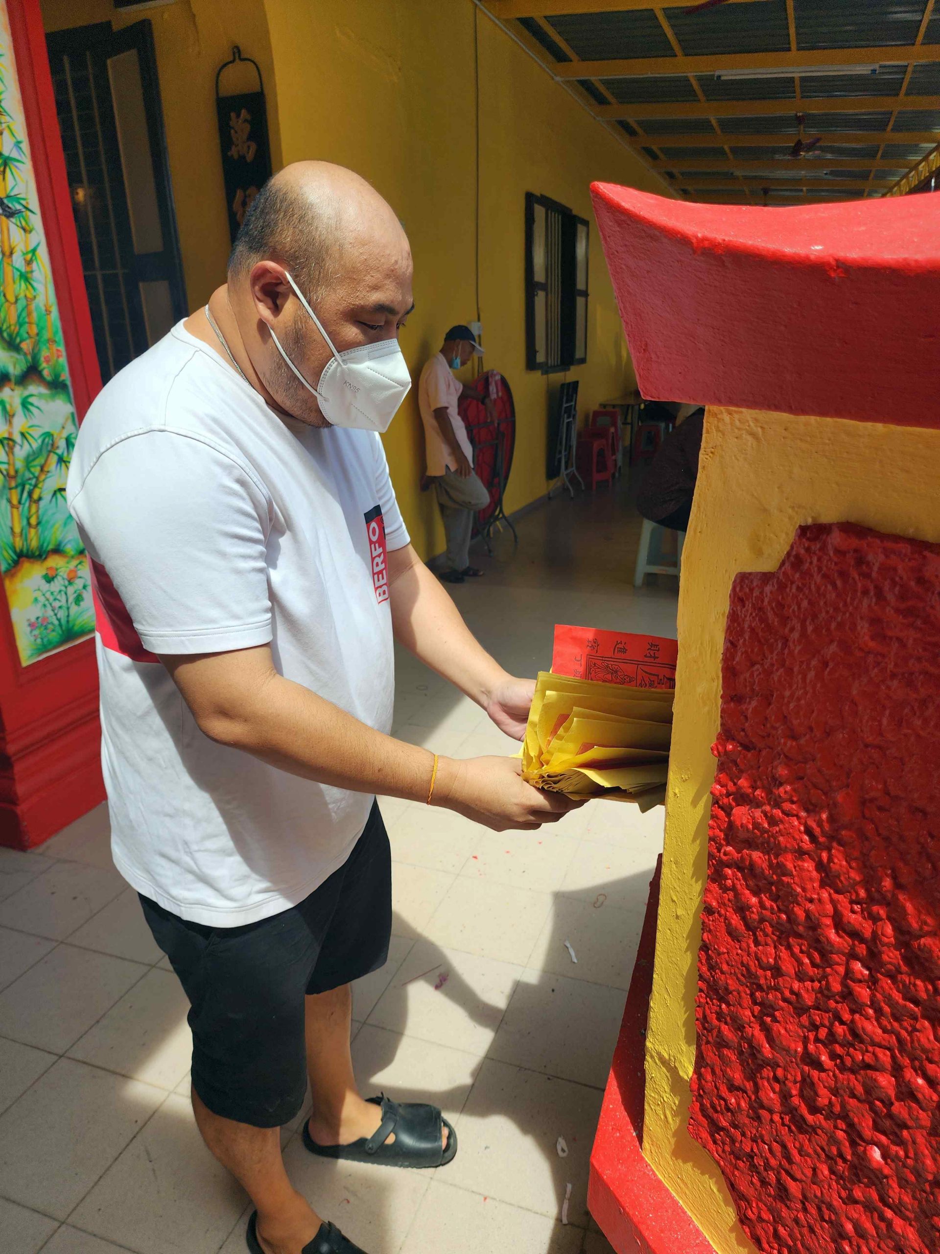 善信王锦涌说,他已经连续6年前来九皇宫祭拜,主要是该宫人较少,便跟着友人一同前来,祈求平安,以及借红包及还红包。