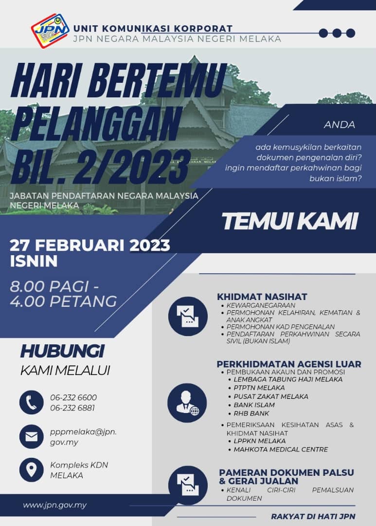 (马六甲22日讯)马六甲国民登记局(JPN)定于本月27日,早上8时至下午4时,于甲州内政部大厦举办会客日,欢迎民众前来询问详情。