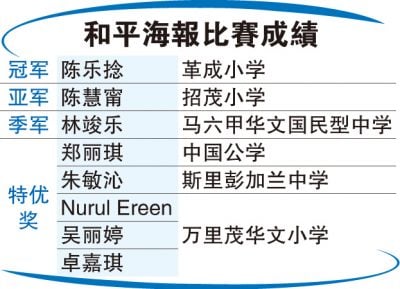 (马六甲7日讯)丹绒比拉拉狮子会日前举办和平海报比赛,开放给全甲州的13岁以下学生参加,革成小学的陈乐捻获得冠军。