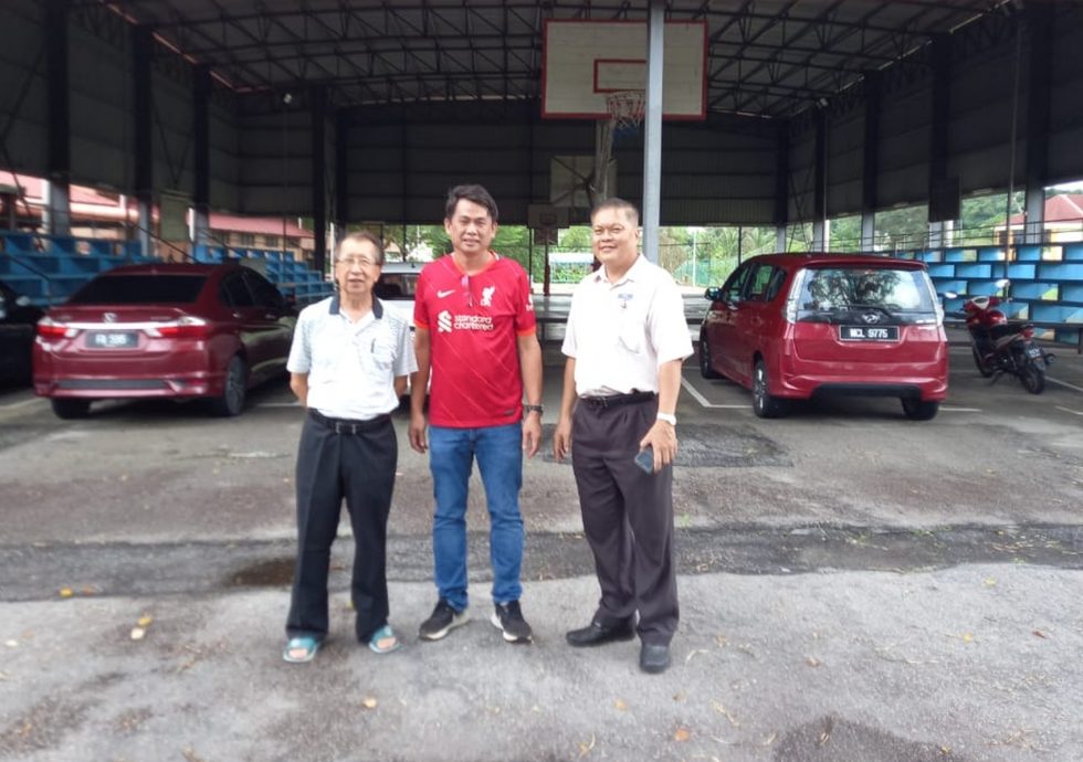 育贤校前地主邱永利(中)到访商议后与魏昌华校长(右)及罗伯庭(左)合影。