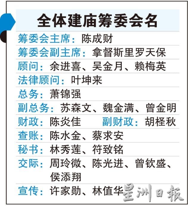 出席者包括该宫主席余进喜、五营坛主黄添旺、财政陈炎佳、建庙筹委会顾问吴金月、主席陈成财、副主席拿督斯里罗天保、总务萧锦强、副总务苏森文及魏金满等。