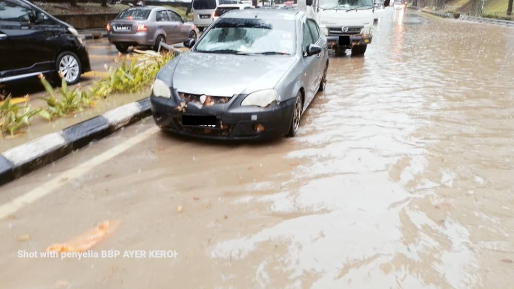 (马六甲29日讯)昨午一场倾盆大雨,导致水位急速上升,爱极乐敦拉萨大道变成排水道,共有10辆车因此抛锚受困在该大道处。