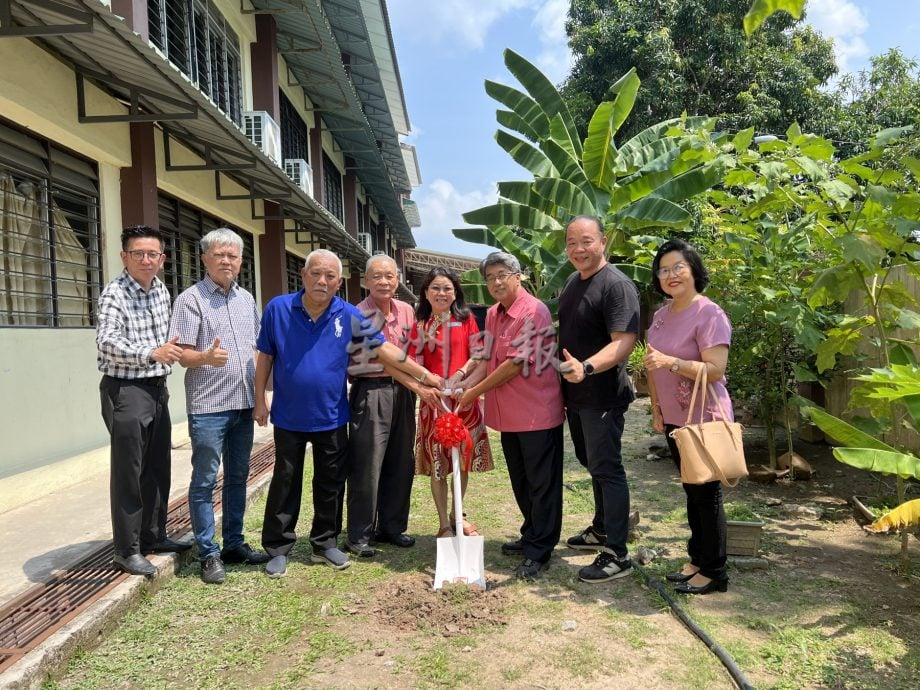 嘉宾为学前教育班建设工程进行动土仪式。右起黄妙霞、姚智辉、古乃光、罗燕俪、李金坡、冯利兴、陈文圈、陈联友。(范纯玮摄)