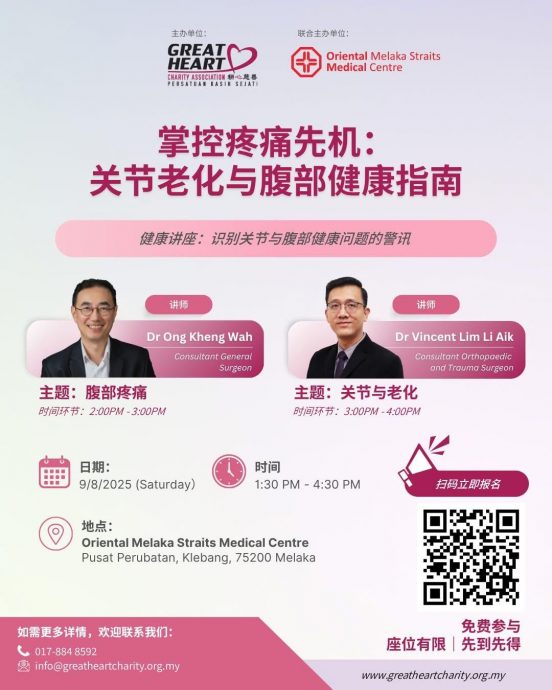 (马六甲29日讯)由甲耕心慈善协会主办的“掌控疼痛先机:关节老化与腹部健康指南”讲座,将于8月9日(星期六)下午1时30分至下午4时30分,在东方医院举行,诚邀广大民众踊跃参与。