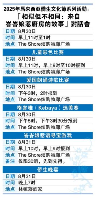 (马六甲28日讯)马来西亚侨生(峇峇娘惹)公会将于8月30日及31日在The Shore炫购物廊广场举办2025年马来西亚侨生文化节,届时将探讨各州娘惹美食文化,也将举办一系列的活动,让民众更进一步了解峇峇娘惹文化!