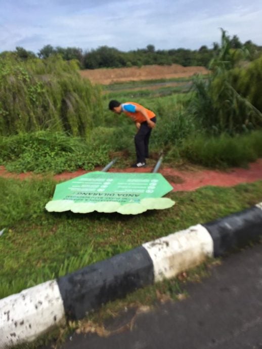 市议会派员拆除已经倾斜的告示牌。(邓永森提供)