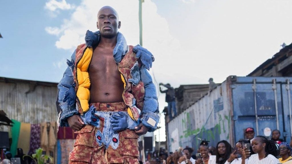 在肯雅最大露天市场尘烟弥漫的巷子里,模特们身着大胆造型,正踏着自信优雅的步伐在临时搭建的T台上走秀。