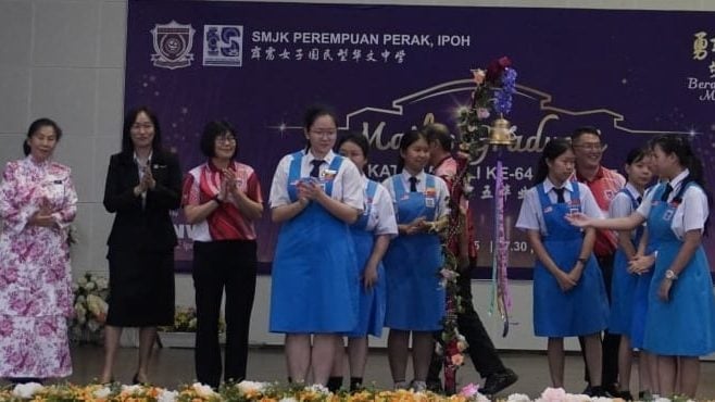 霹雳女中日前举行第64届中五毕业典礼,全体中五学生及教师齐聚在该校礼堂,共同为中五学生的中学生涯画下美好句点,今年的毕业典礼主题为“勇敢追梦,步履生辉”,寓意学生们怀抱勇气与梦想,踏上新的人生征途,并在未来的人生道路上闪耀光芒。