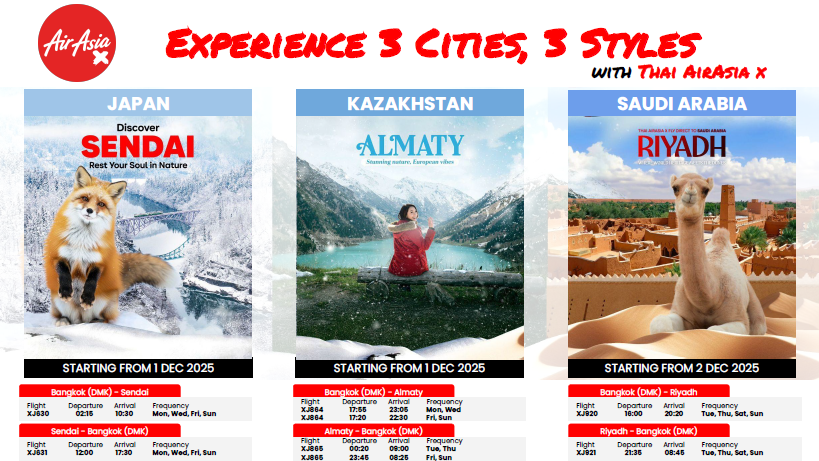泰国亚航X宣布开通3条全新直飞航线,12月起从曼谷直飞沙特阿拉伯利雅得、日本仙台及哈萨克斯坦的阿拉木图。