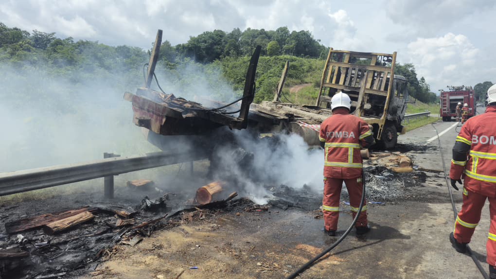 一辆运木桐罗里3天前被运输车撞上后,一直停在马路上未被移走,昨晚一对年轻夫妻共乘摩托车途经时,不幸撞上,当场死亡。而该辆“夺命罗里”,于今早,即意外发生约15小后,失火烧毁。