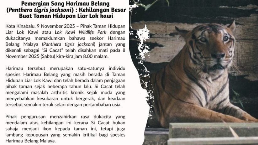 马来西亚世界自然基金会(WWF)指出,马来亚虎不仅是极度濒危的动物,在野生动物界中仅剩不到150头,它更是我国勇敢、力量与荣耀的象征;令人痛心的是,它的生命竟在马来西亚日被陷阱与枪弹夺走。这不仅是一种对生态系统的罪行,也伤害了民族精神。